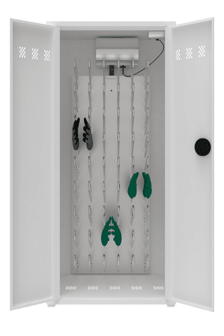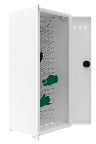 El armario está disponible con sistemas de secado en acero inoxidable (304) y acero resistente al agua de mar (316) y es adecuado para secar 20 ó 30 pares de guantes.