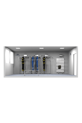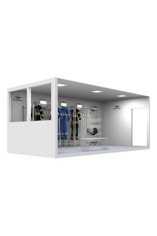 De serie, el contenedor está equipado con sistemas de secado para trajes de trabajo (pesados), calzado y guantes, con capacidad para un máximo de 20 personas. La unidad está completamente preparada y solo hay que conectarla a la red eléctrica para poder empezar a utilizarla inmediatamente.