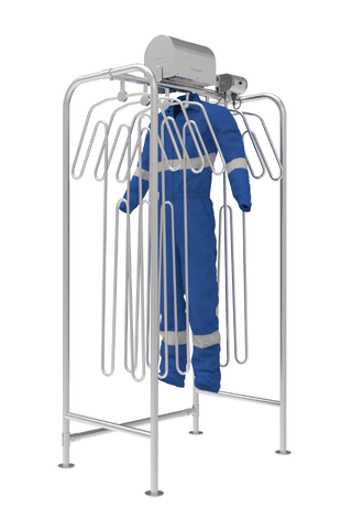 El secador de trajes AIR está disponible para montaje en pared, independiente y móvil. Está fabricado en acero inoxidable (304) o acero resistente al agua de mar (316). Con una sola secadora de monos se puede secar la ropa de trabajo de 4 a 10 personas, o varias. El sistema está conectado al soplador de aire caliente FLOW300 y puede encenderse y apagarse fácilmente con el temporizador digital de 10 horas.