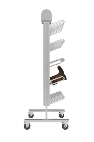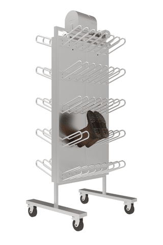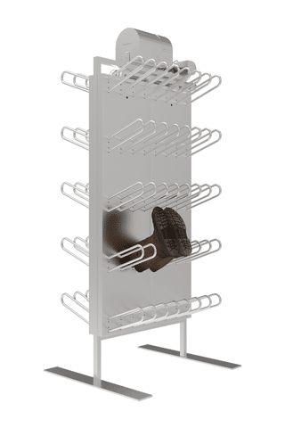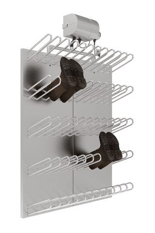 Our boot and shoe dryer: a warm and fast drying of all type of shoes by using a large amount of air, which flows through the continuous stainless steel framework and rounded hangers. The hangers contain nozzles, through which the air enters the shoes. One of the main advantages of drying with slightly warmed up air is that it is particularly gentle on materials such as leather and high-tech fabrics. Finally, because of the equal and constant air flow, all shoes are dried within a short amount of time approx. 1-2 hours, ensuring that the people can start their next shift warm and dry.