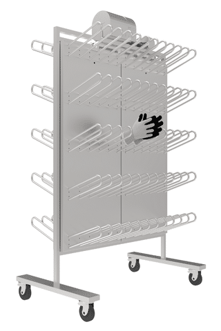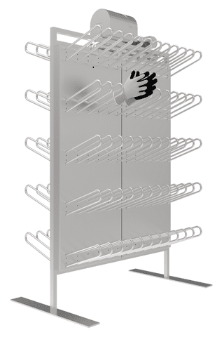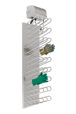 A warm and fast drying of all type of gloves by using a large amount of air, which flows through the continuous stainless steel framework and rounded hangers. The hangers contain nozzles, through which the air enters the gloves. One of the main advantages of drying with slightly warmed up air is that it is particularly gentle on materials such as leather and high-tech fabrics. Finally, because of the equal and constant air flow, all gloves are dried within a short amount of time approx. 1-2 hours, ensuring that the people can start their next shift warm and dry.